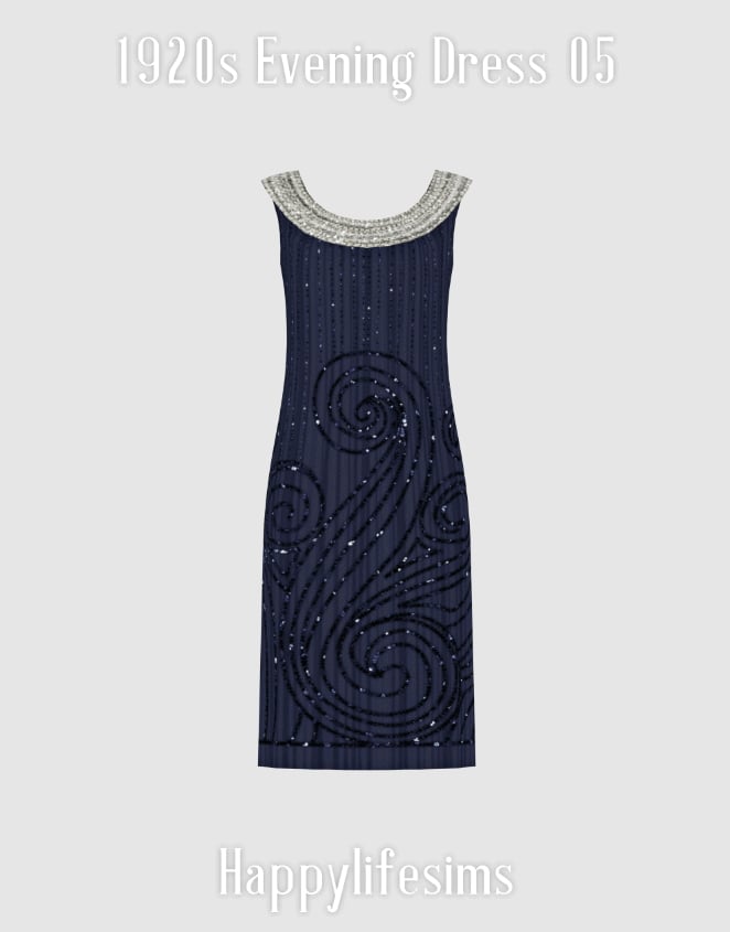 This evening dress reflects mid-to-late 1920s formal fashion, characterised by a straight, columnar silhouette and a dropped waistline. The beaded surface decoration and geometric swirl motifs are consistent with Art Deco design trends popular during the decade. Sleeveless evening dresses like this were worn for formal dinners, dances, and social events, often paired with long gloves, jewellery, and styled hair such as finger waves.