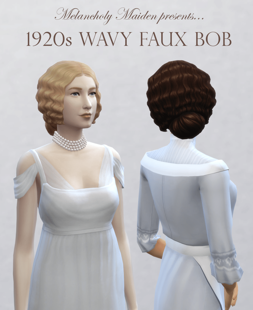This faux bob hairstyle reflects mid-1920s women’s fashion, characterised by softly sculpted waves and a compact silhouette that imitated the increasingly popular short haircut. Faux bobs allowed longer hair to be styled to appear cropped, aligning with contemporary trends while remaining socially acceptable for women who did not wish to cut their hair.