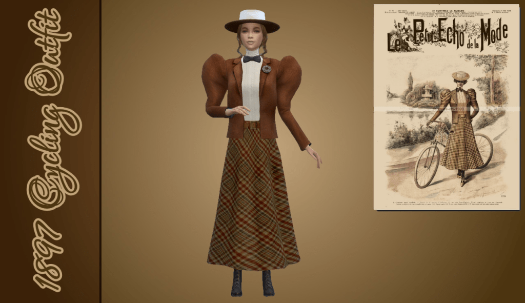 This style is consistent with fashion imagery from approximately 1895–1900, a period in which women’s cycling attire became more standardised and visually associated with the broader tailored aesthetic of the late Victorian era.